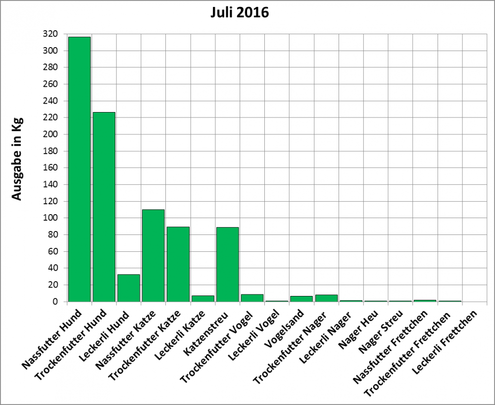 Dank eurer Hilfe haben wir im Juli 95 Hunde, 83 Katzen, 11 Vögel, 10 Nager und 2 Frettchen satt bekommen.